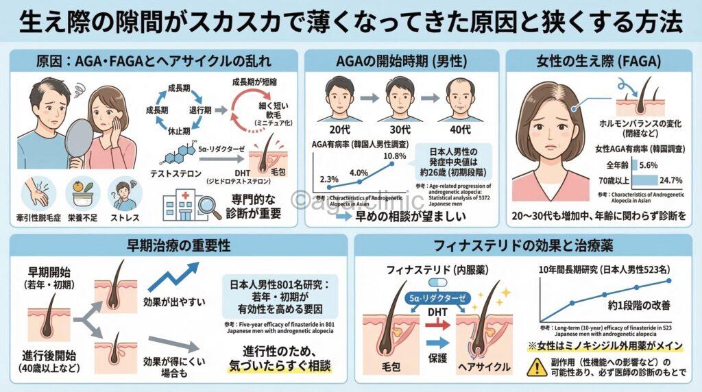 生え際の隙間がスカスカで薄くなってきた場合、考えられる原因はAGA、FAGA、牽引性脱毛症、ホルモンバランスの変化、生活習慣の乱れなど複数あります。